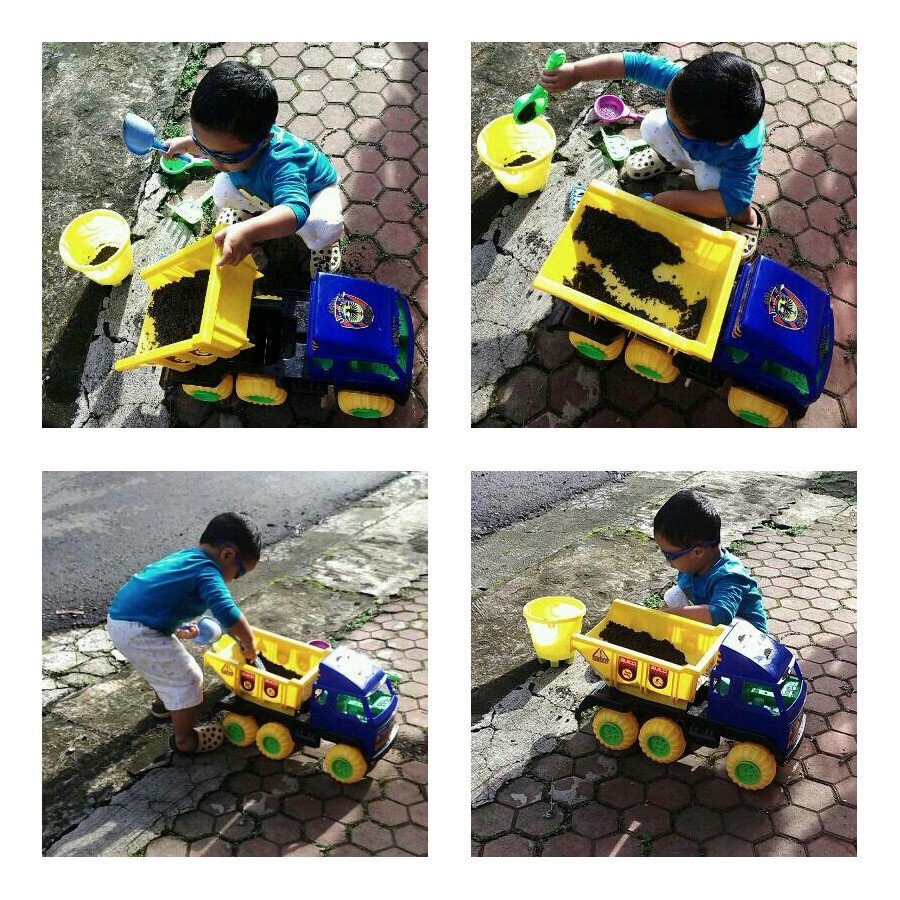 Dan….semua orang tahu kalau dia ituh cintak sama mobil dan truk. Tetangga-tetangga dan kerabat juga tahu dia itu cinta truk. Makanya waktu ultahnya Java kemarin. Hampir 95% kado yang diterima Java adalah mobil-mobilan dan atau truk-truk an. Dan ini adalah salah satu truk kado ulangtahun Java kemarin. Hmm..bahagia bangget, cyin dia main pasir begituh.