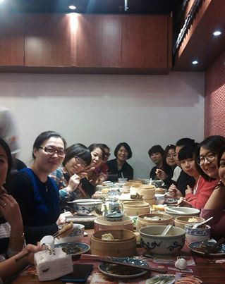 Kita makan siang di sebuah restoran khas China yang rwame bangget tapi orderan kita cepet datangnya lho. Padahal kita belum reservasi sebelumnya. And here we are.…ga usah bertanya-tanya daku yang mana. Tuh yang kelihatan sikutnya doang dan bongkahan pipi itu adalah daku 😀